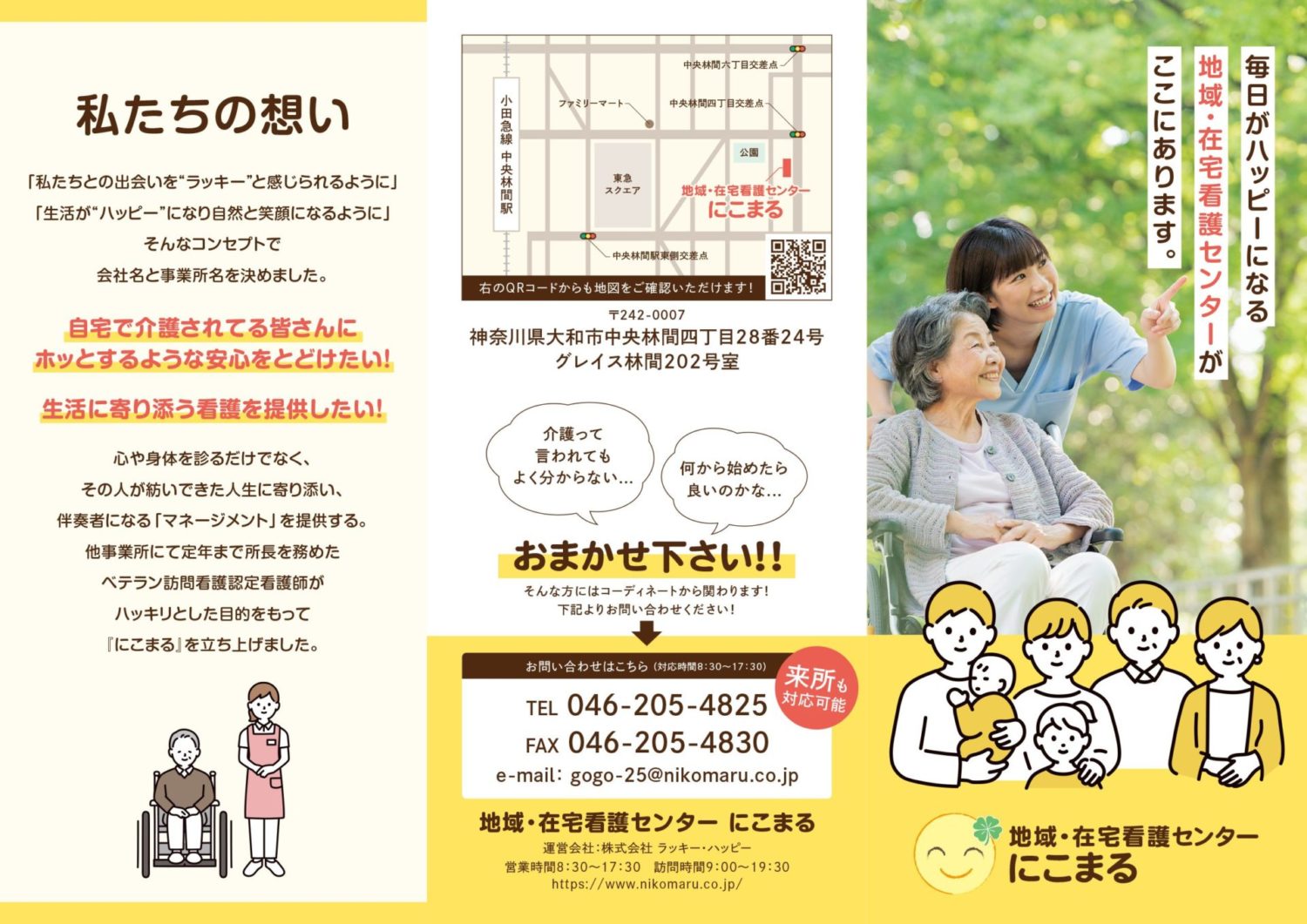 株式会社ラッキー・ハッピー様よりご依頼いただき、同社が運営されている訪問看護センターである『地域・在宅看護センター にこまる』の三つ折りリーフレットを作成しました。