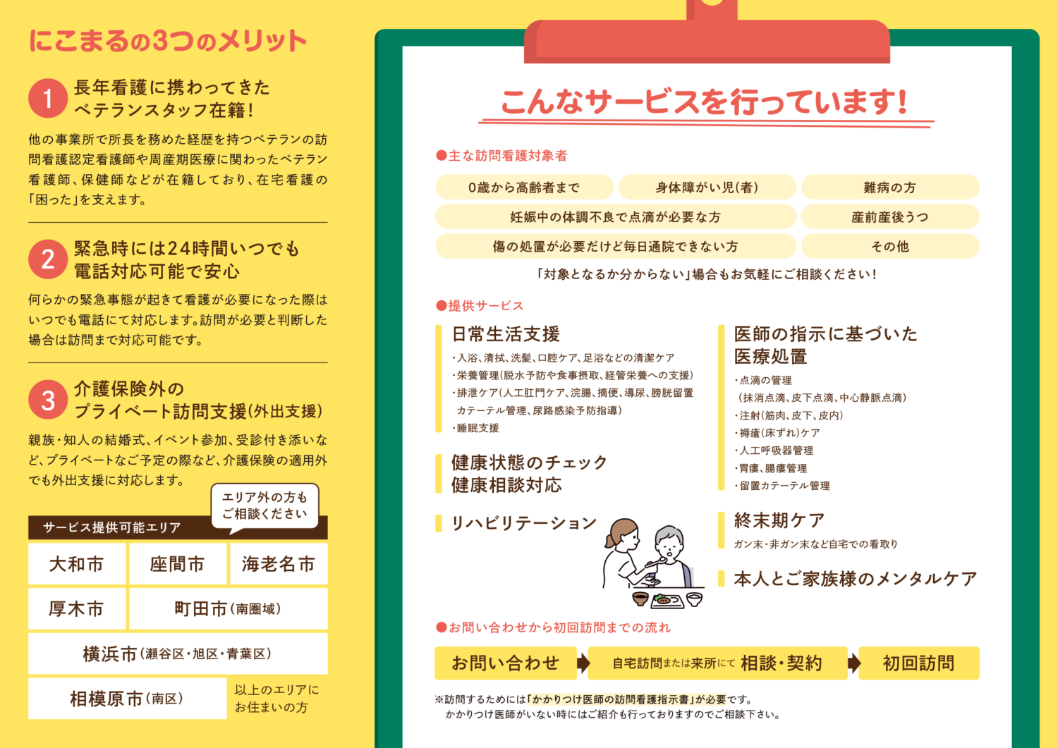 業務内容的にも「訪問看護を初めて検討している」などの“慣れていないお客様”に多く読まれることが予想されるため、そのような方にもご理解いただけるよう「どんなことが出来るか」や「流れ」を大きく掲載。また、にこまるの「強み」でありお客様からの「選ばれる理由」でもある「3つのポイント」をピックアップし「にこまるに依頼するメリット」を伝えたり、実際にサービスを提供しているエリアなど、お客様目線での必要な情報を選定し、伝わりやすいよう整理して掲載しています。